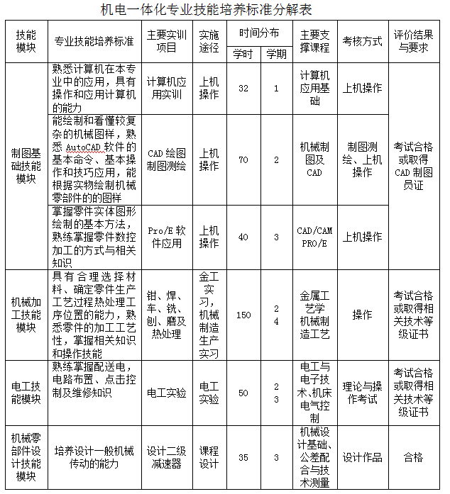 二、机电一体化专业技能培养标准分解表
