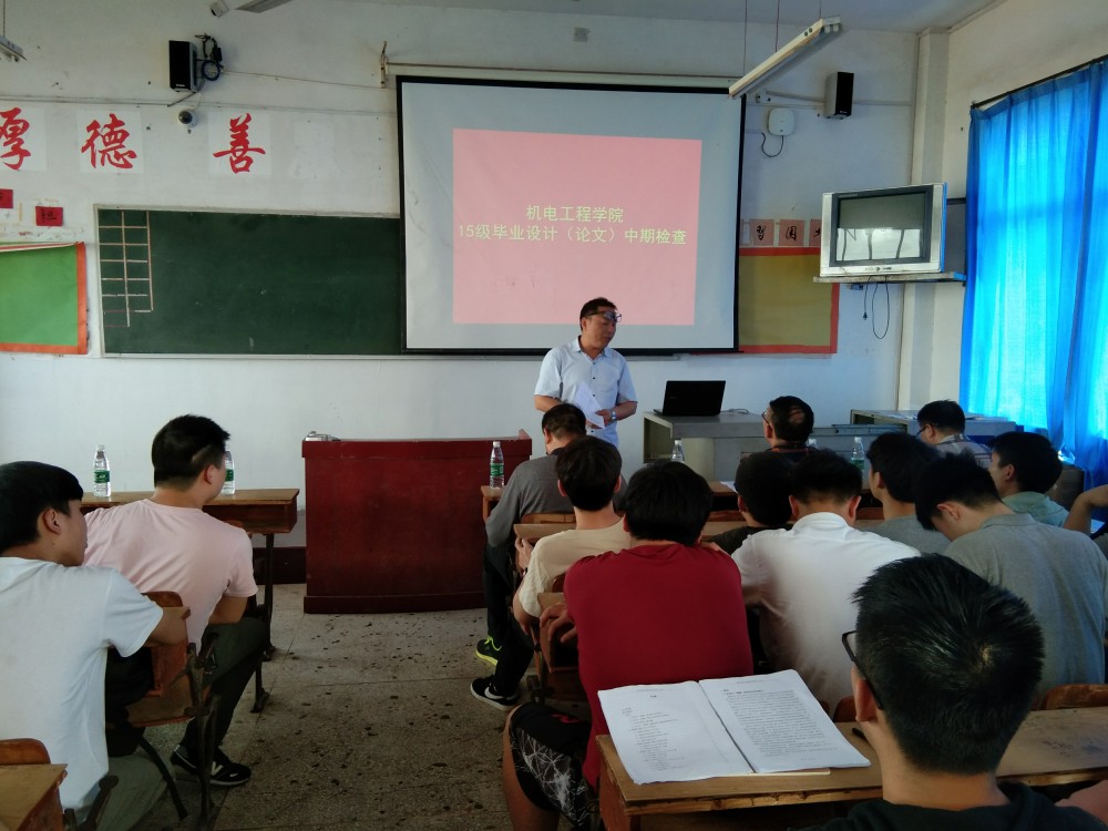 为进一步加强我院毕业设计(论文)工作的规范化管理,及时发现毕业设计(论文)过程中存在的问题,保证毕业设计(论文)质量,学院于2019年4月24日在教学楼开展了15级毕业设计(论文)中期检查工作汇报会,到会的领导有刘平娥校长,高科院三位专家,教务处陈伟民副处长、肖珍老师,机电学院冯院长、杨院长以及各教研以主任。到会的学生有被抽查到的12位学生及50余位学生代表参加。汇报工作按步进行,冯院长作了中期检查汇报,12位学生进行了毕业设计工作汇报,高科院专家提问。最后专家作了总结点评,充分肯定我院毕业设计工作,管理规范,进度合理,学生汇报有理有节,同时对部分学生提出了宝贵意见。为我院毕业设计后续工作起到了很好的指引作用。