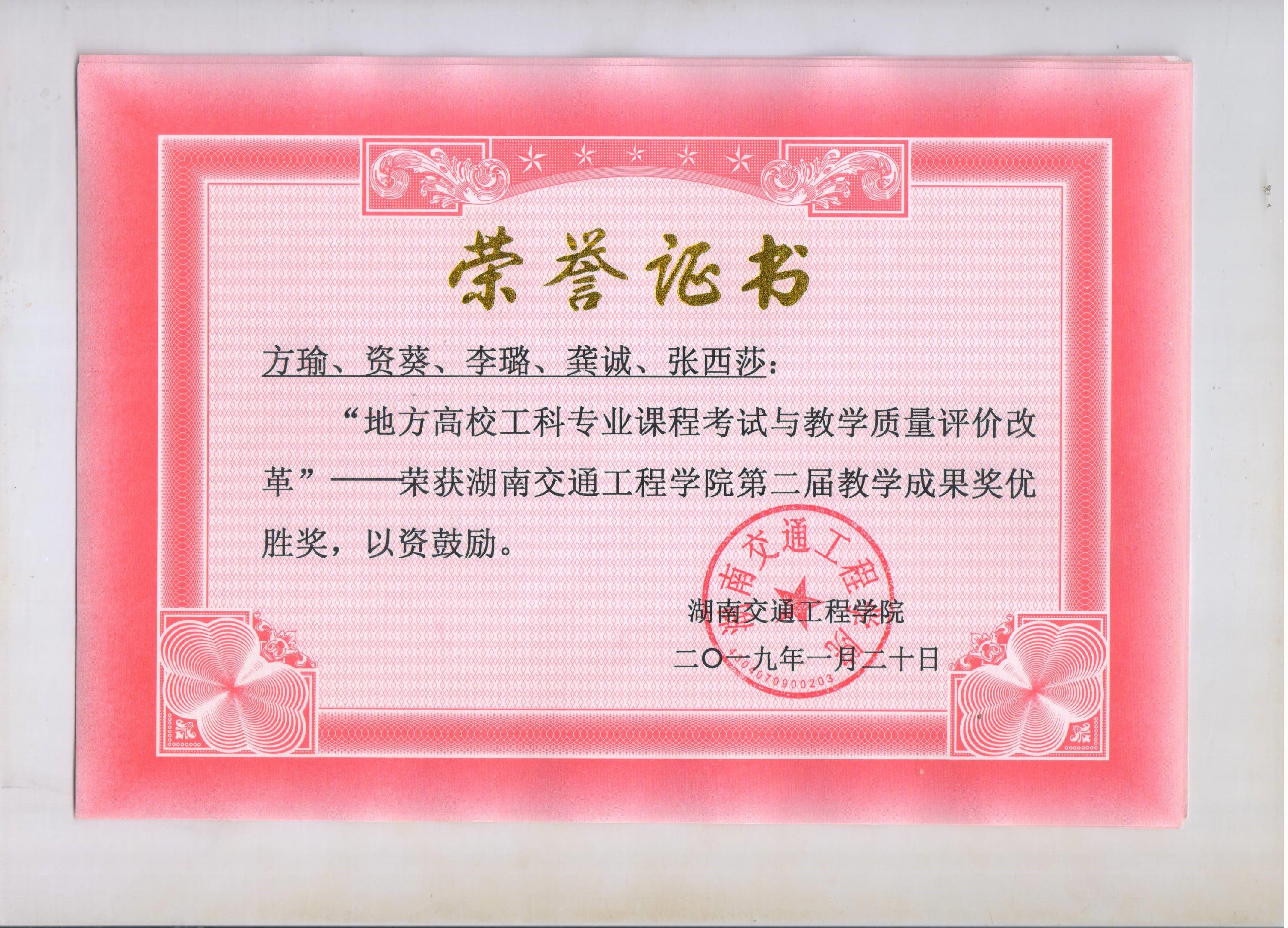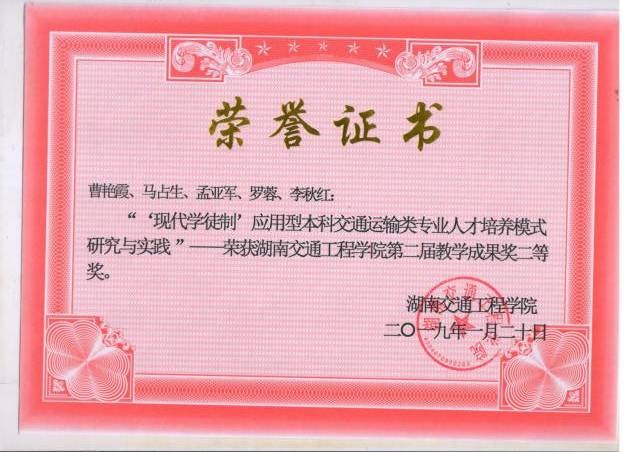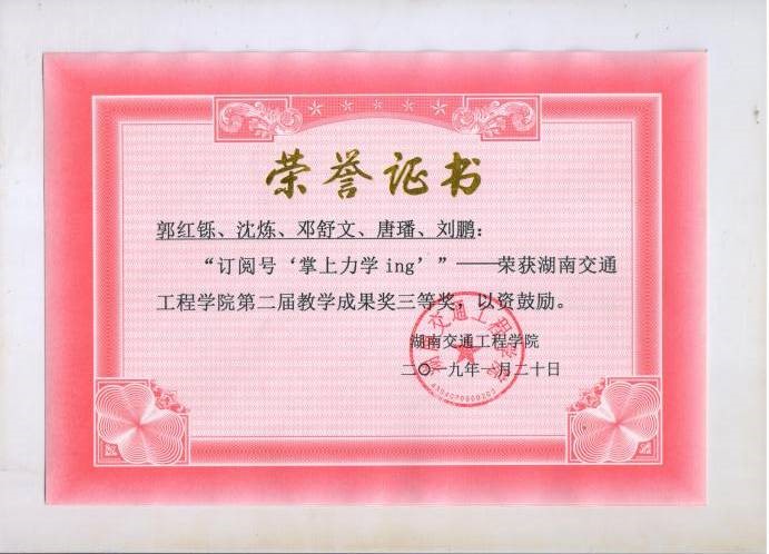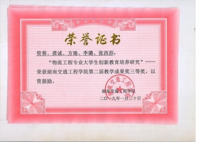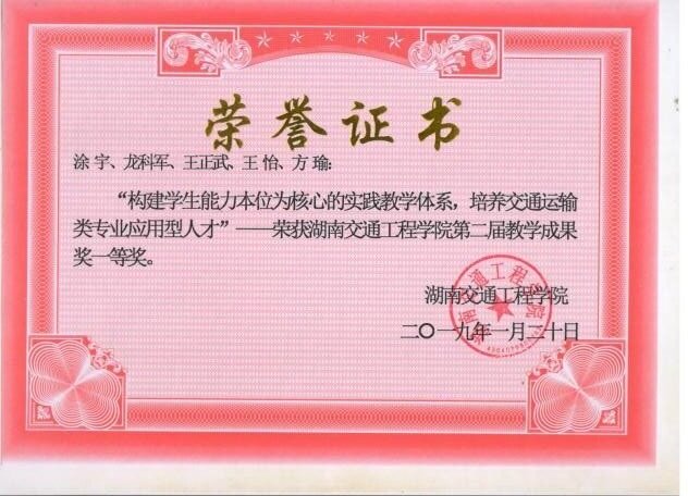 根据湖南省教育厅发布《关于开展第十二届湖南省高等教育教学成果奖励工作的通知》(湘教通〔2018〕553号),我院全体教师积极响应政策,参加学校教学成果奖的申报、评选,我院共5组教师团队进行申报,其中《构建学生能力本位为核心的实践教学体系》(完成人:涂宇、龙科军、王正武、方瑜)获得一等奖,《“现代学徒制”应用型本科交通运输类专业人才培养模式研究与实践》(完成人:曹艳霞、马占生、孟亚军、罗容、李秋红)获得二等奖,《物流工程专业大学生创新教育培养研究》(完成人:资葵、龚诚、方瑜、李璐、张西莎)、《订阅号“掌上力学”》(完成人:郭红铄、沈炼、邓舒文、唐璠、刘鹏)获得三等奖。其中《构建学生能力本位为核心的实践教学体系》被学校推荐参加第十二届湖南省高等教育教学成果奖的竞选。