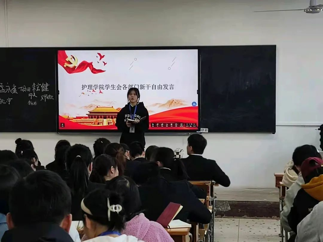 随后护理学院学生会主席团代表朱宏健、管理组代表、各部门新干、执行主席石晶进行发言,执行主席石晶就近期学生会存在的问题进行了指正。