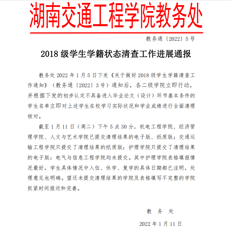 2018 级学生学籍状态清查工作进展通报