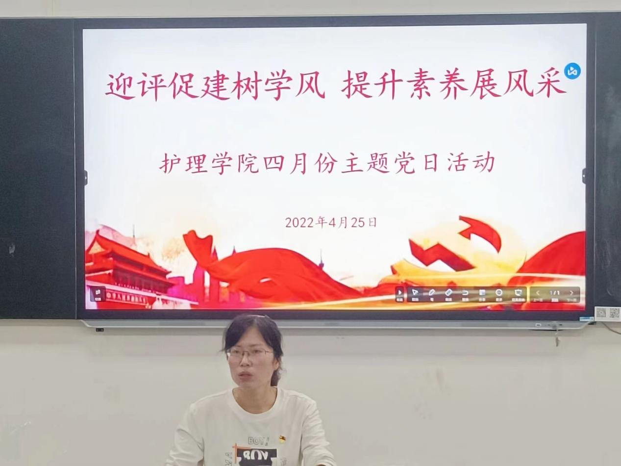 4月25日,护理学院党总支在教学楼101教室,开展四月“迎评促建树学风,提升素养展风采”主题党日活动。参加此次活动的有护理学院党总支书记邓丽、副书记肖桂香、教工党支部书记周艳平、全体教师、学生党员。会议由副书记肖桂香主持。