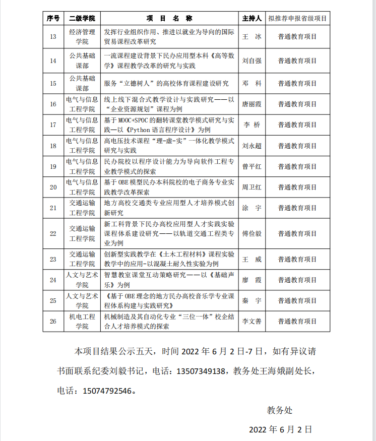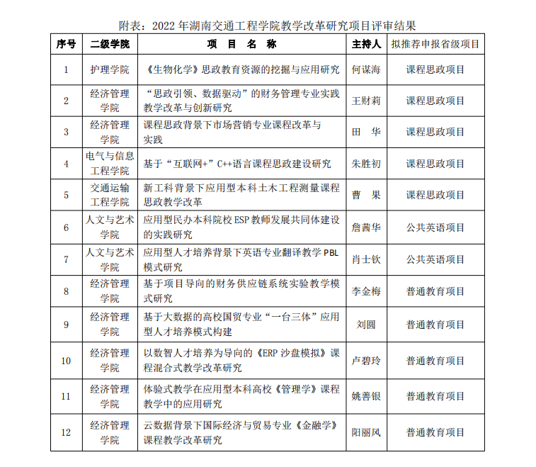 2022年6月1日,学校组织专家对2022年教学研究改革项目进行了集中评审,通过评审拟推荐护理学院 的“《生物化学》思政教育资源的挖掘与应用研究”等26个项目(课程思政项目5项、公共英语项目2项、普通教育项目19项)校级立项并拟申报省级教研教改项目。