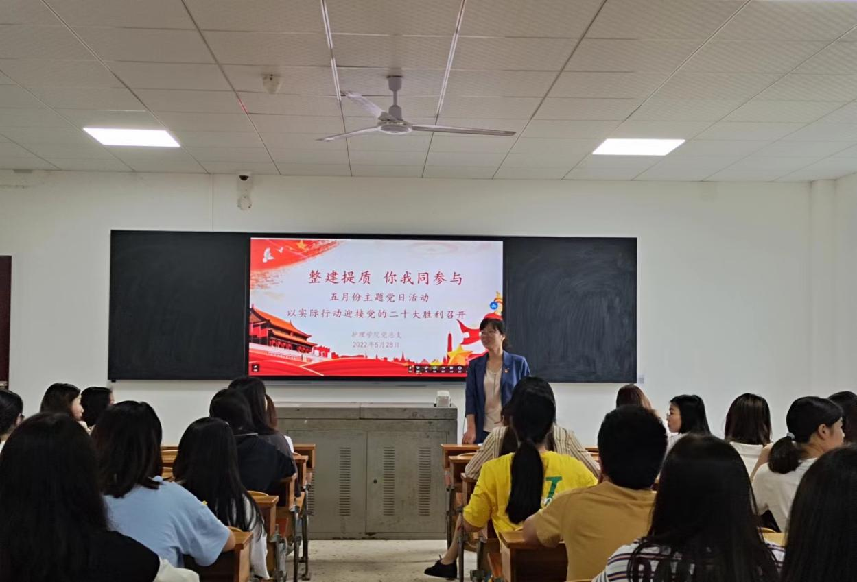 为以实际行动迎接党的二十大的顺利召开,护理学院党总支于528上午在教学楼104教室召开了以整建提质你我同参与为主题的五月份主题党日活动参加此次会议的有护理学院党总支书记邓丽、团总支书记兼党总支副书记肖桂香、教工党支部书记周艳平、学生党支部书记贺九芳14栋临时党支部书记刘梯、全体教师、学生党员。