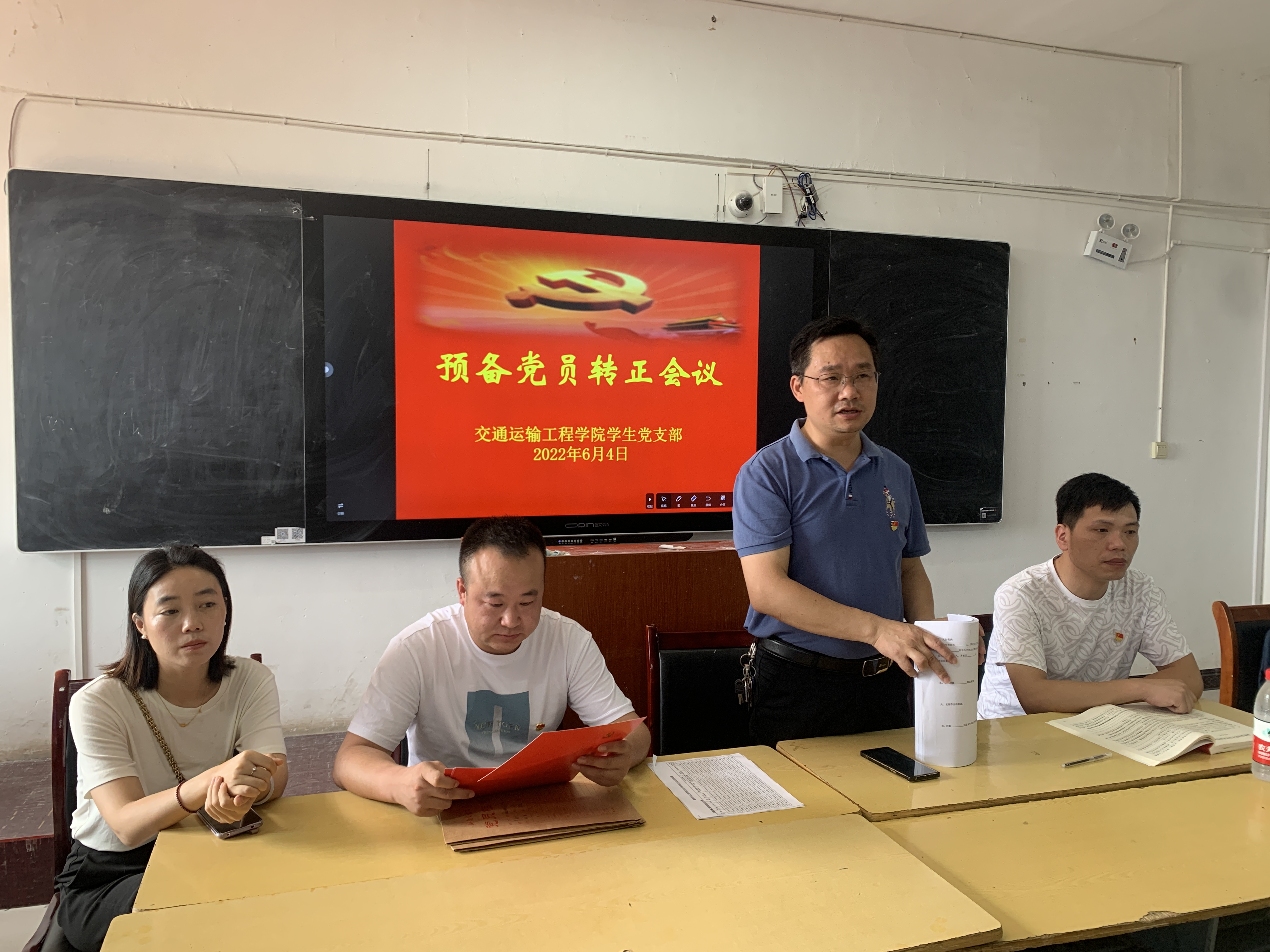 2022年6月4日8:30在机电楼512教室召开交通运输工程学院预备党员转正会议,出席本次会议的有党总支何美生书记、学生党支部全体党员和53名预备党员,大会由学生党支部书记王刚主持。