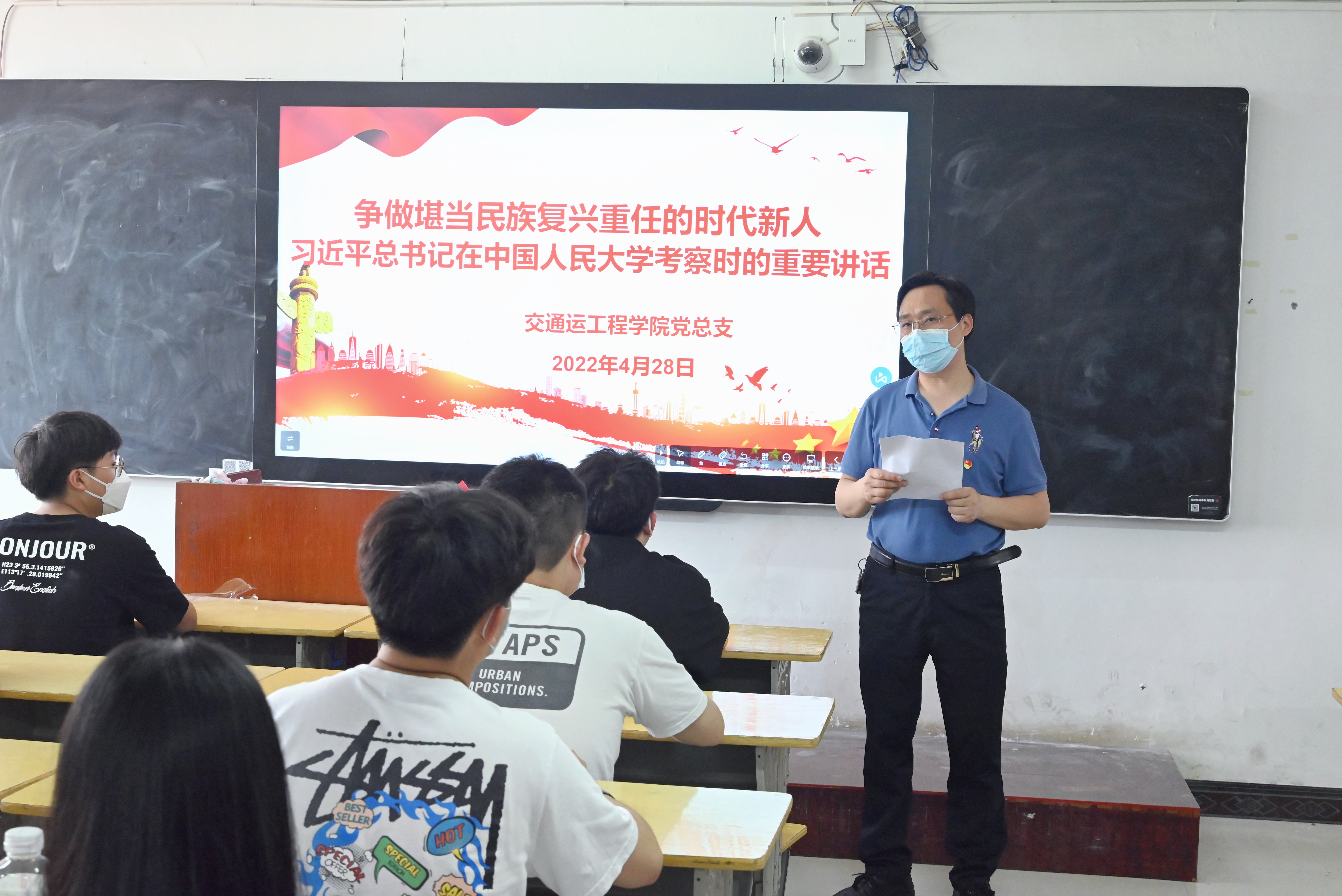 本网讯(通讯员 摄影 胡雅兰)为了更好的学习习近平总书记在中国人民大学考察时的重要讲话,2022年4月28日交通运输工程学院党总支组织全体在校党员以“争做堪当民族复兴重任的时代新人”为主题开展了一次党课学习活动,本次党课由交通运输工程学院党总支书记何美生主持。