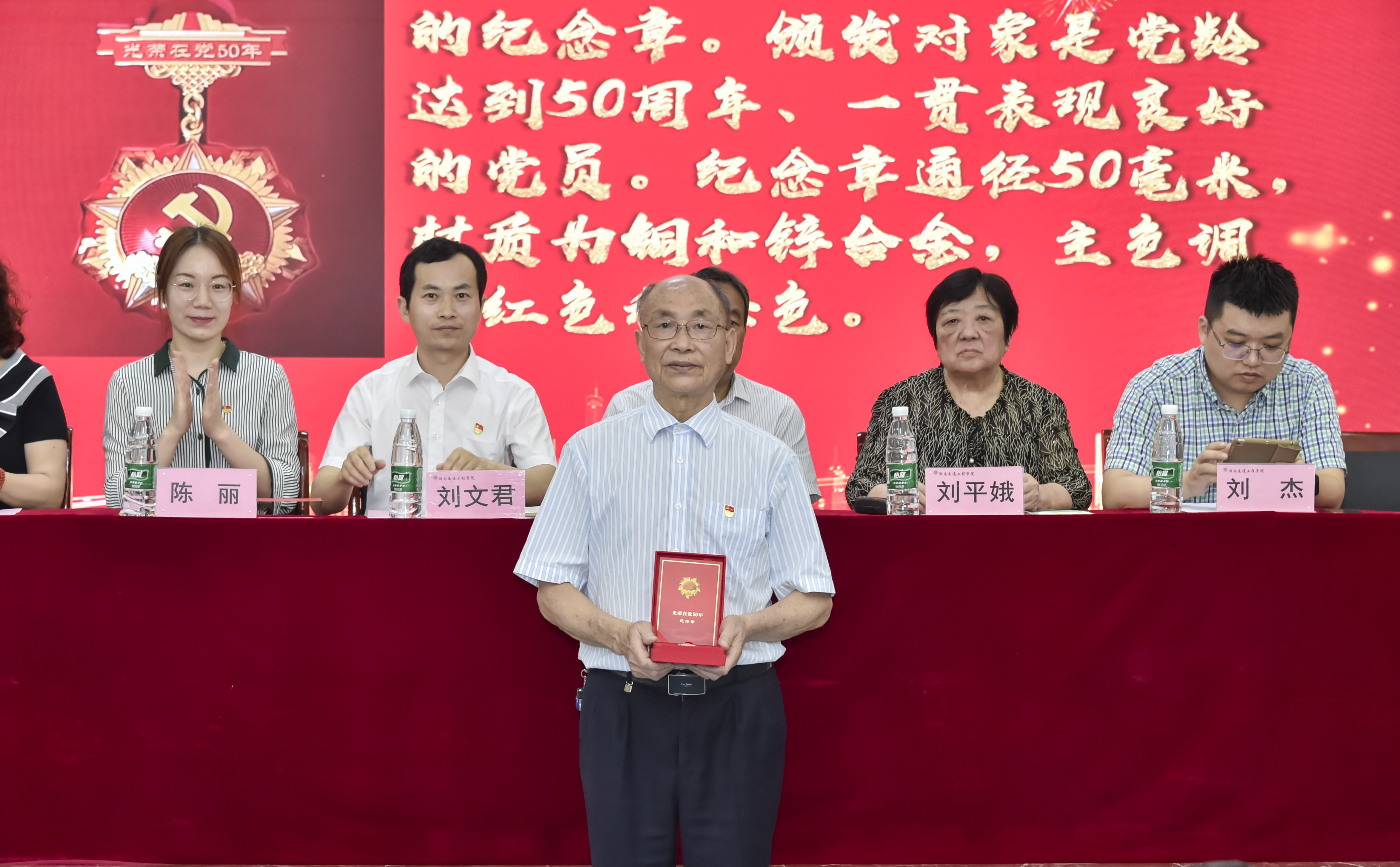 ▲刘文君向在党50年的老党员李先聪颁发在党50周年纪念章