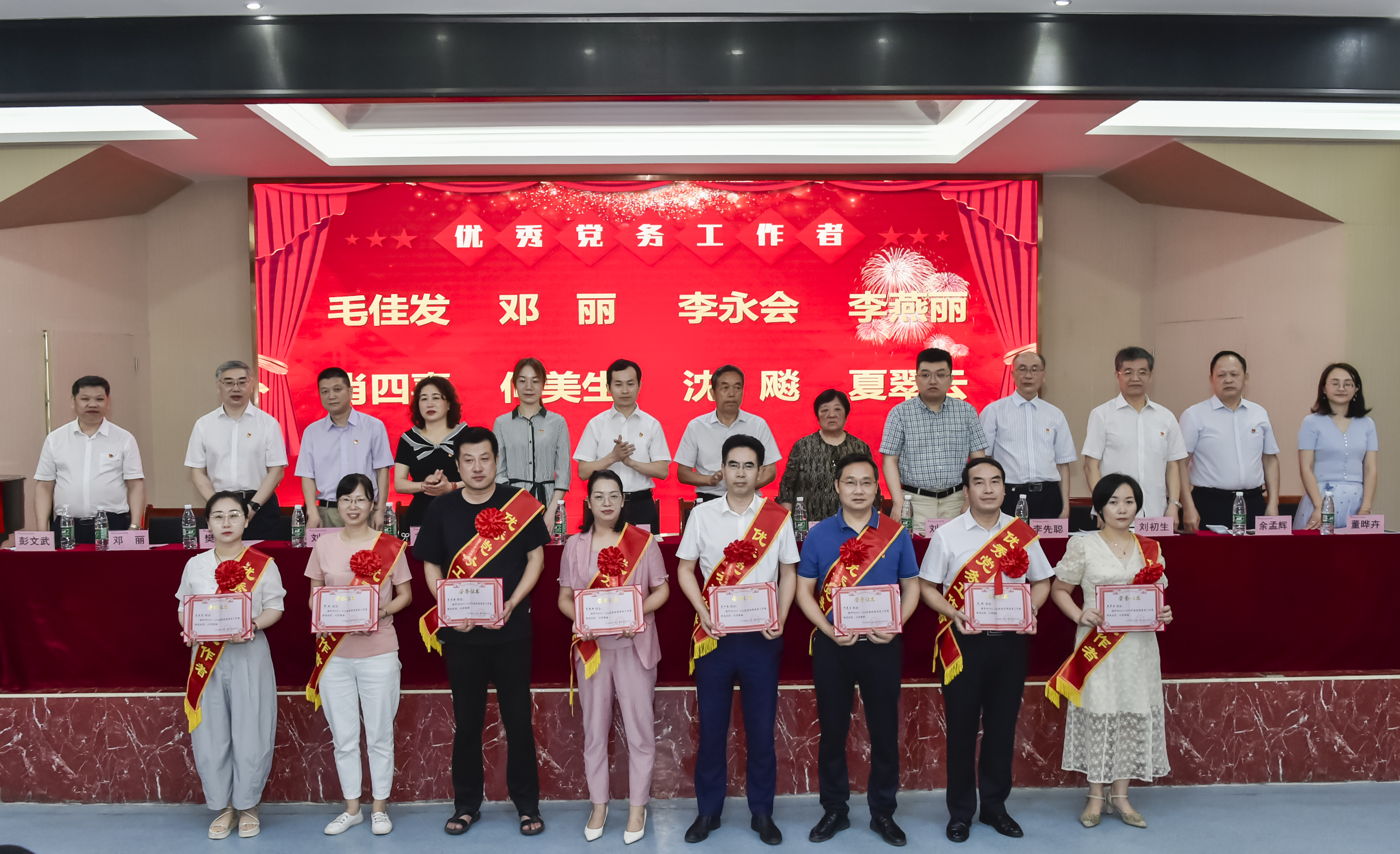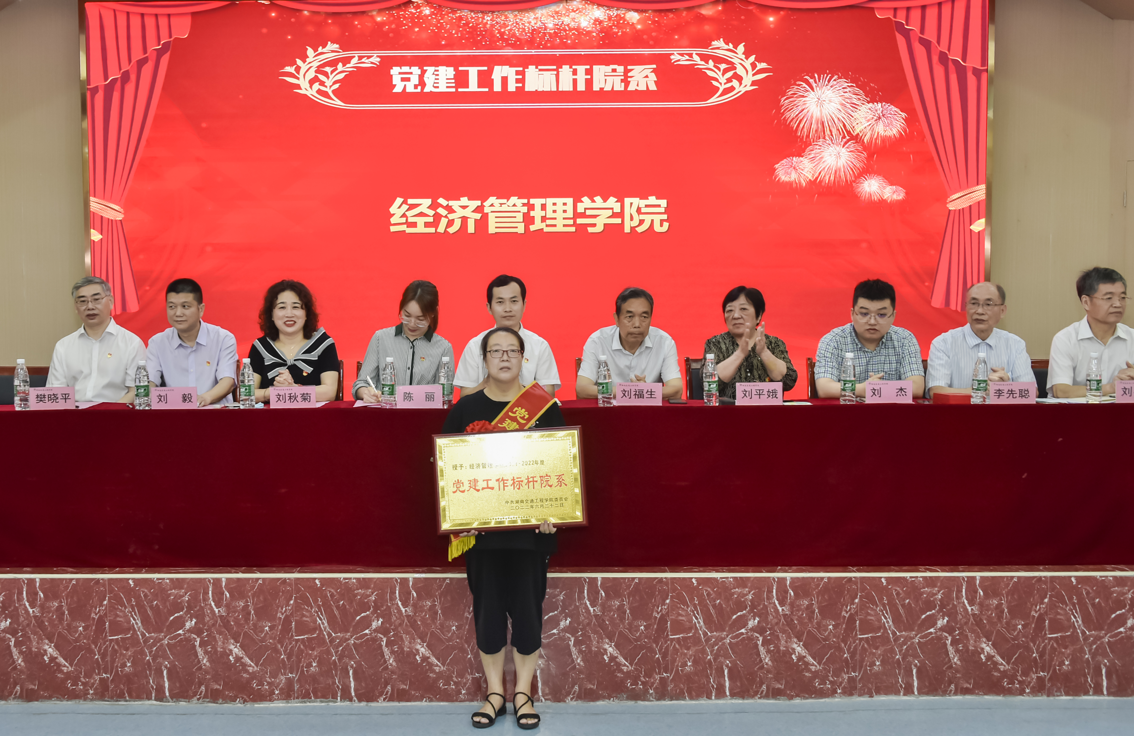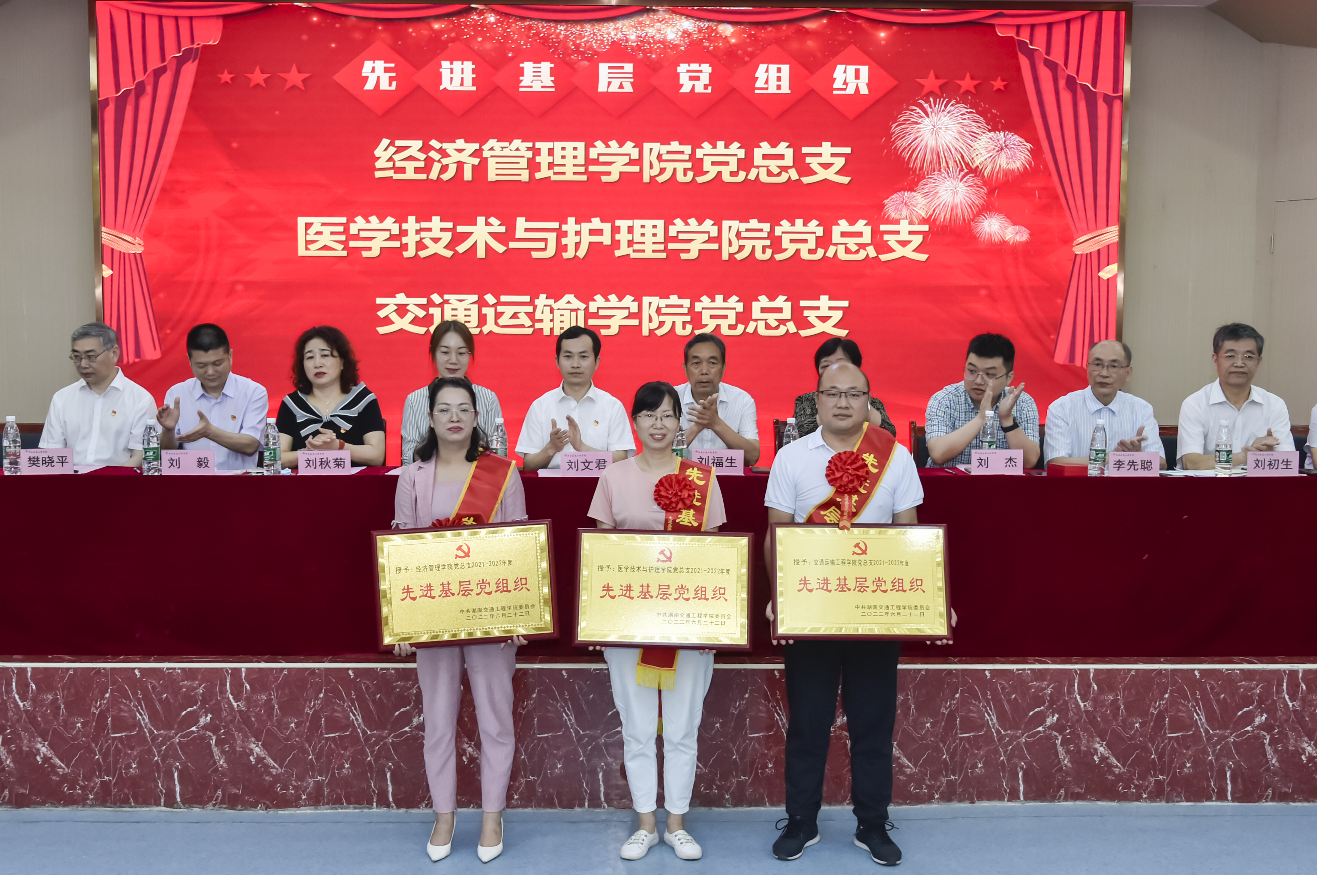 会议分二个阶段进行。第一阶段举行表彰仪式。李先聪宣读了学校《关于表彰2021-2022年度“七一”表彰的决定》。表彰了经济管理学院党总支等3个“先进基层党组织”, 等8位“优秀党务工作者”,王刚等49位“优秀共产党员”。参会校领导分别为获得表彰的个人、集体进行了颁奖并合影,会场响起热烈掌声。
