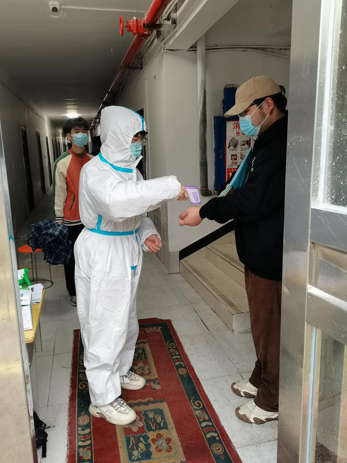 志愿者为出人同学测量体温