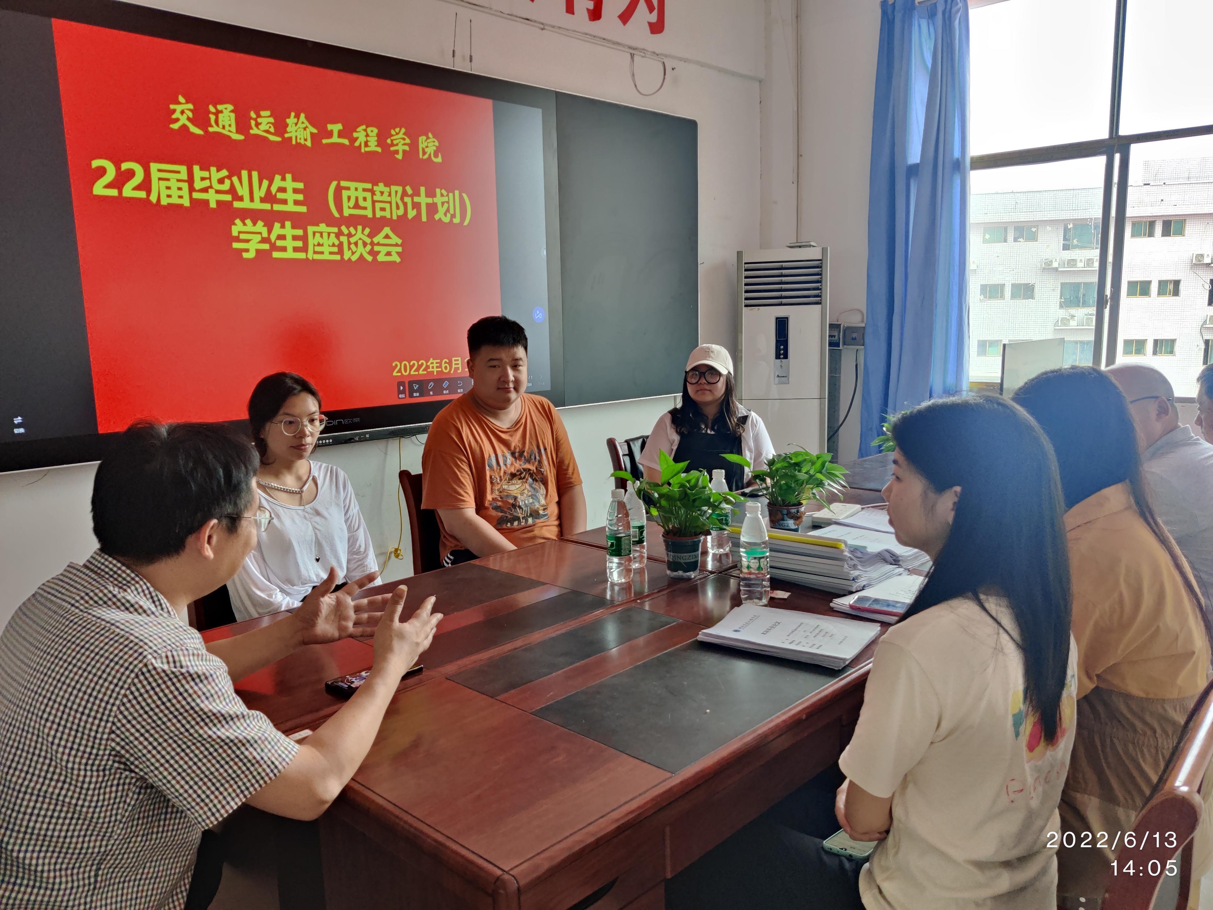 6月13日下午,交通运输工程学院2022年“西部计划”志愿者座谈会在机电楼511办公室召开。出席本次座谈会的有交通运输工程学院党总支何美生书记、何文华副书记和五名自愿加入“西部计划”的志愿者。