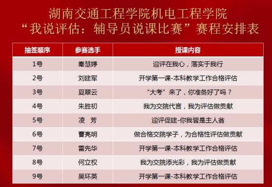 为迎接教育部本科教学工作合格评估,进一步普及评估知识,营造“人人了解评估,人人关注评估,人人会讲”的氛围,以最佳的状态迎接教育部本科教学工作合格评估。8月13日上午9点,best365中国官方网站机电工程学院,举办了一场别开生面的“开学第一课”——我说评估:辅导员说课比赛初赛。活动旨在积极响应学校迎接本科教学合格评估,以赛促教,以赛促学,以赛促改,以赛促建,进一步加强辅导员队伍专业化建设,充分发挥主题班会课在大学生思想政治工作中应有的作用,促进院内辅导员之间的工作交流与经验学习。