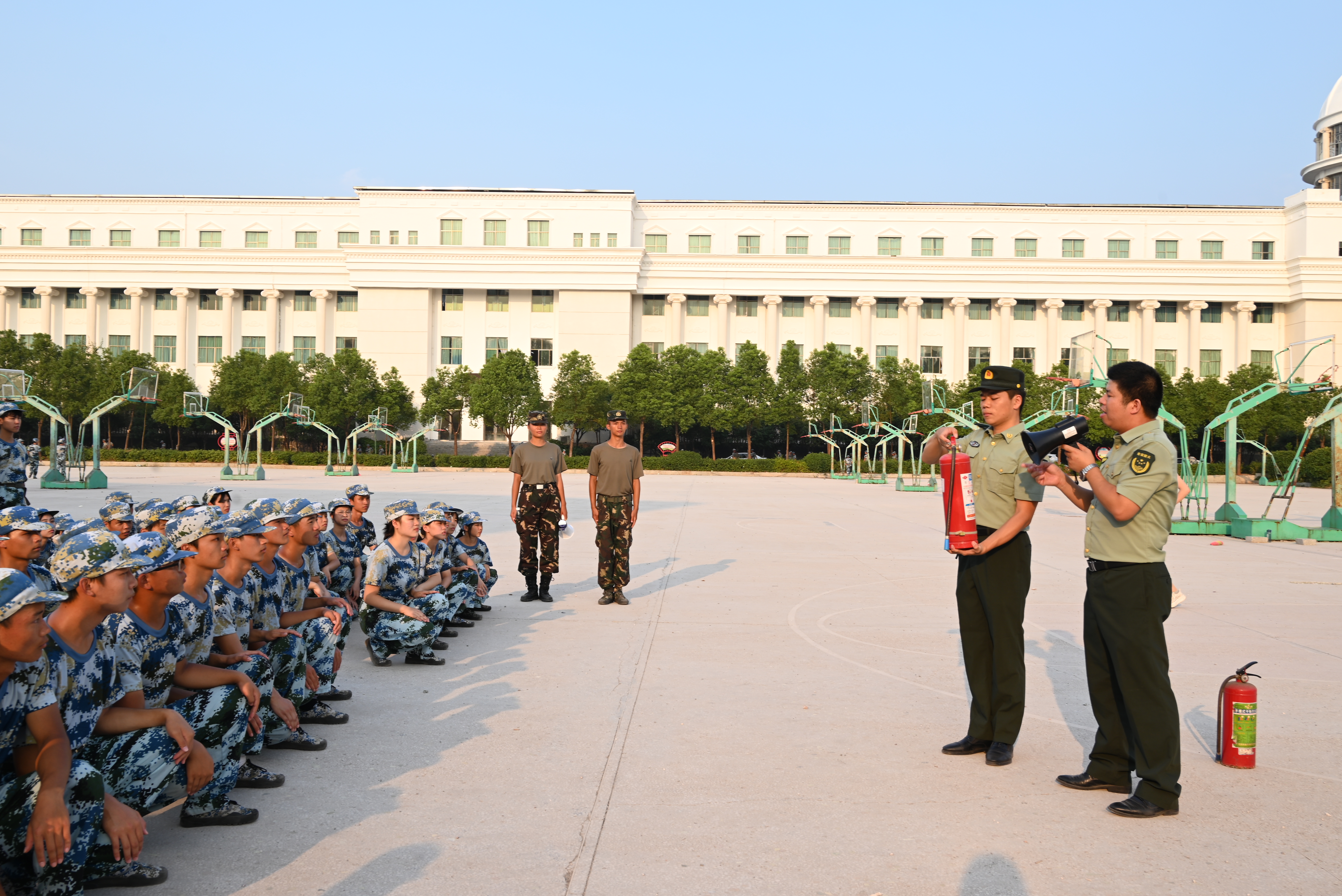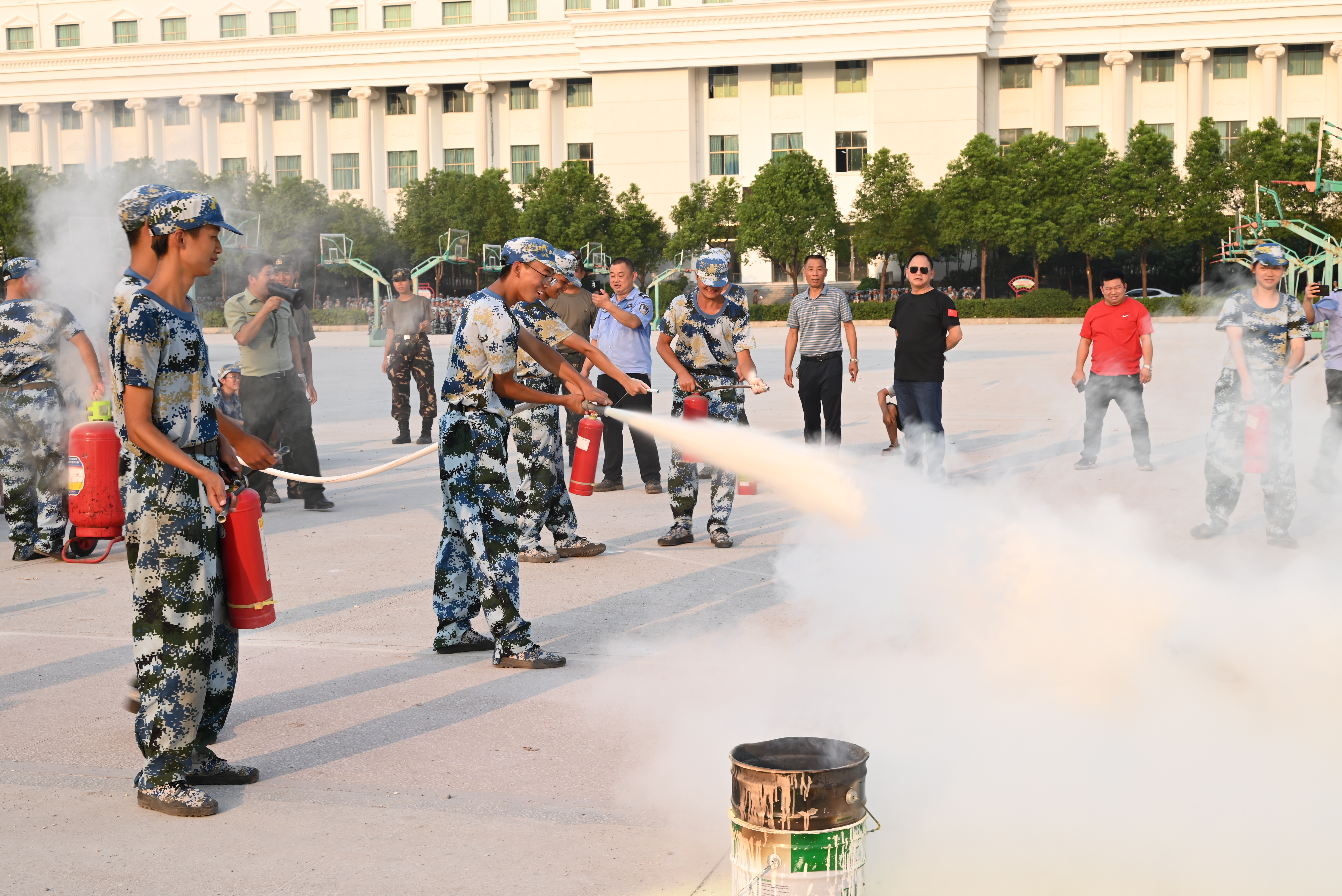 下午4时,在教学楼和田径场举行消防演练。保卫处相关工作人员和带训教官为同学们作了如何避险、如何逃生、如何使用灭火器等方面的理论讲解,并实战演练了灭火器灭火等项目。参加演练的2022级新生在教学楼二楼进行了火灾应急疏散逃生、在田径场进行了使用干粉灭火器灭火等科目的演练。