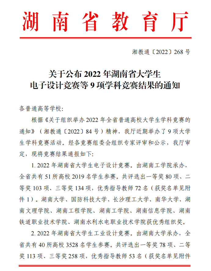 关于公布2022年湖南省大学生电子设计竞赛等9项学科竞赛结果的通知