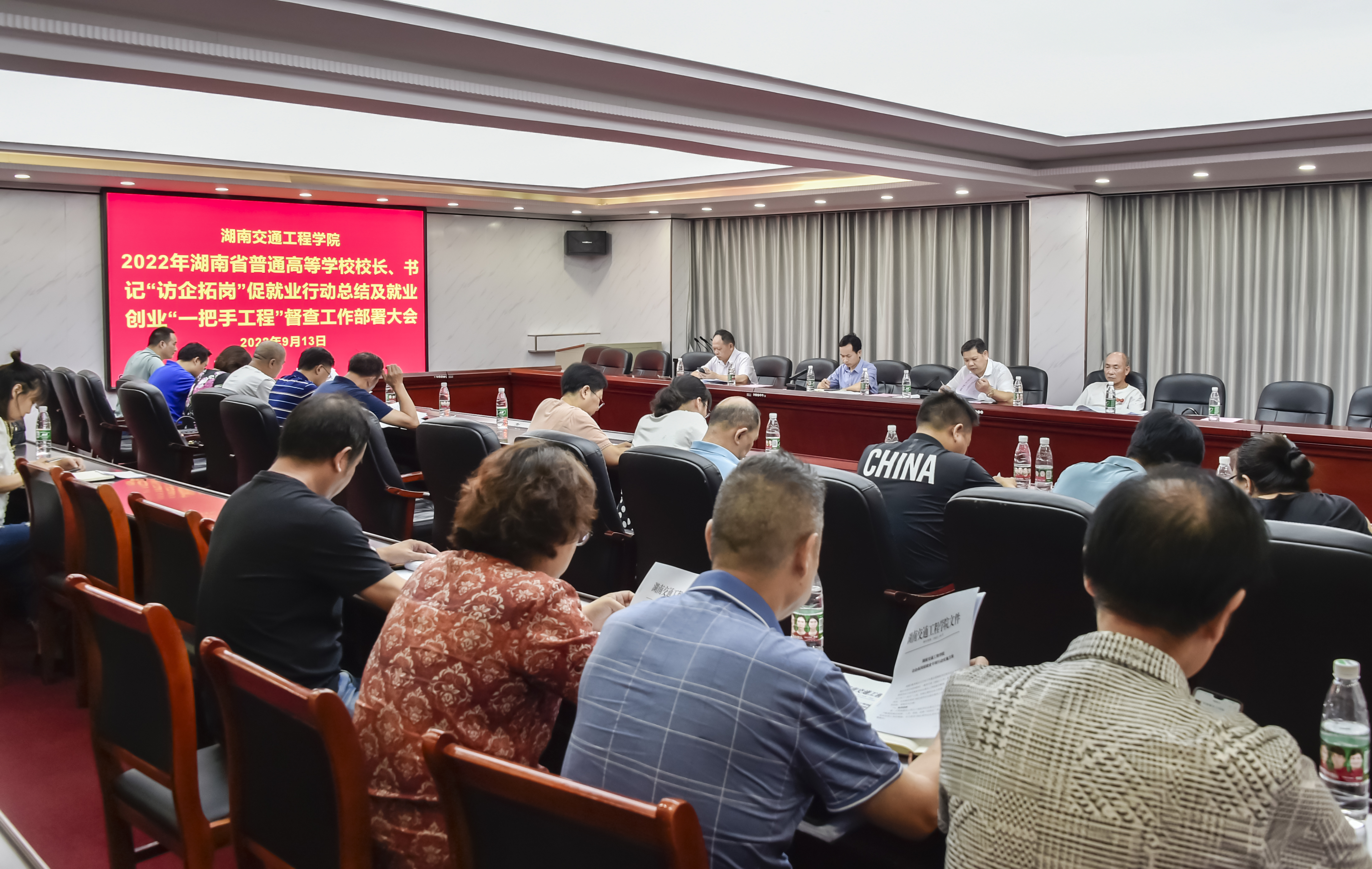 本网讯通讯员 赵红深  摄影 李建华 )9月13日上午,学校在体育馆103会议室召开2022届毕业生就业工作总结暨2022年湖南省普通高等学校就业创业工作“一把手工程”督查工作部署会议,校长陈治亚、党委书记刘文君、常务副校长彭文武、副校长余孟辉出席会议。党政办、宣传部、组织部、教务处、人事处、学工部、团委、招生与就业处、创新创业学院负责人及各二级学院党总支书记参会。