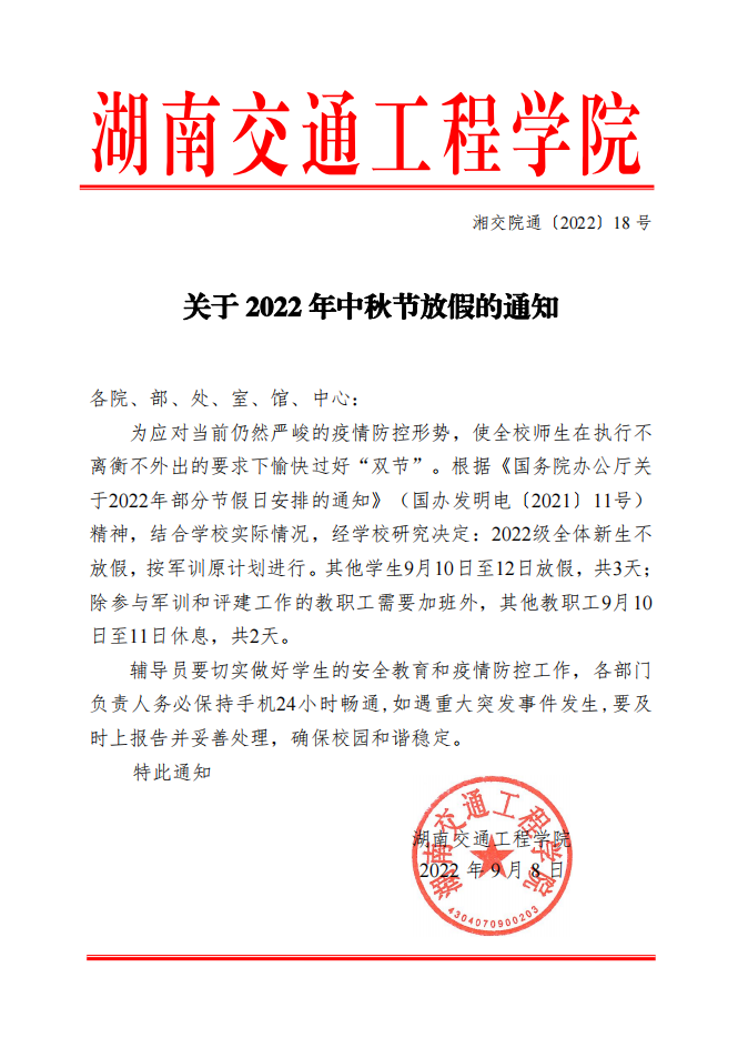 关于2022年国庆节假期安排及实施冬令作息时间的通知